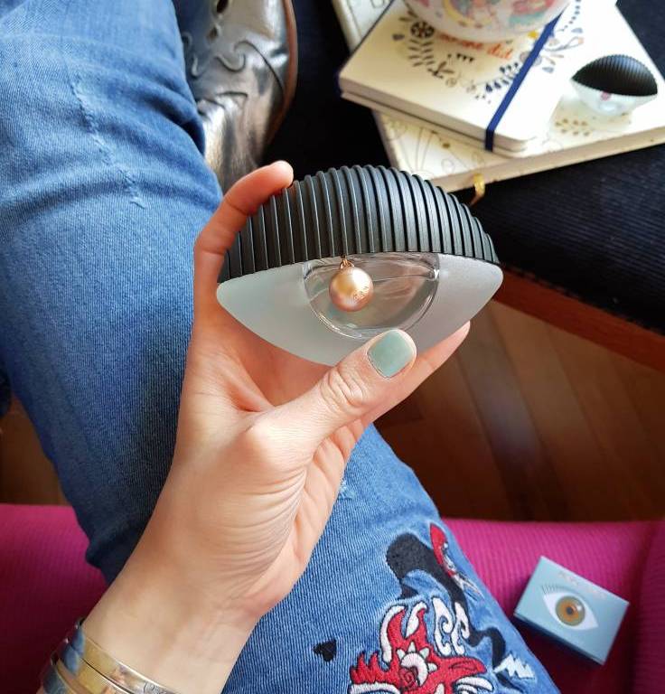 El frasco atrae todas las miradas, entre goma negra, oro rosa y opalina. Todo recuerda al mix and matchde la moda KENZO. El tapón gommato inspirado en los bolsos icónicos KENZO Kalifornia, el precioso detalle de metal de oro rosa como la colección de joyas «THE EYE», el tacto del cristal mate, realzan la belleza de este enfoque radical provocando una confrontación visual insólita. Misterioso y fascinante, visto de frente o desde arriba, el ojo se revela bajo todos sus ángulos.
