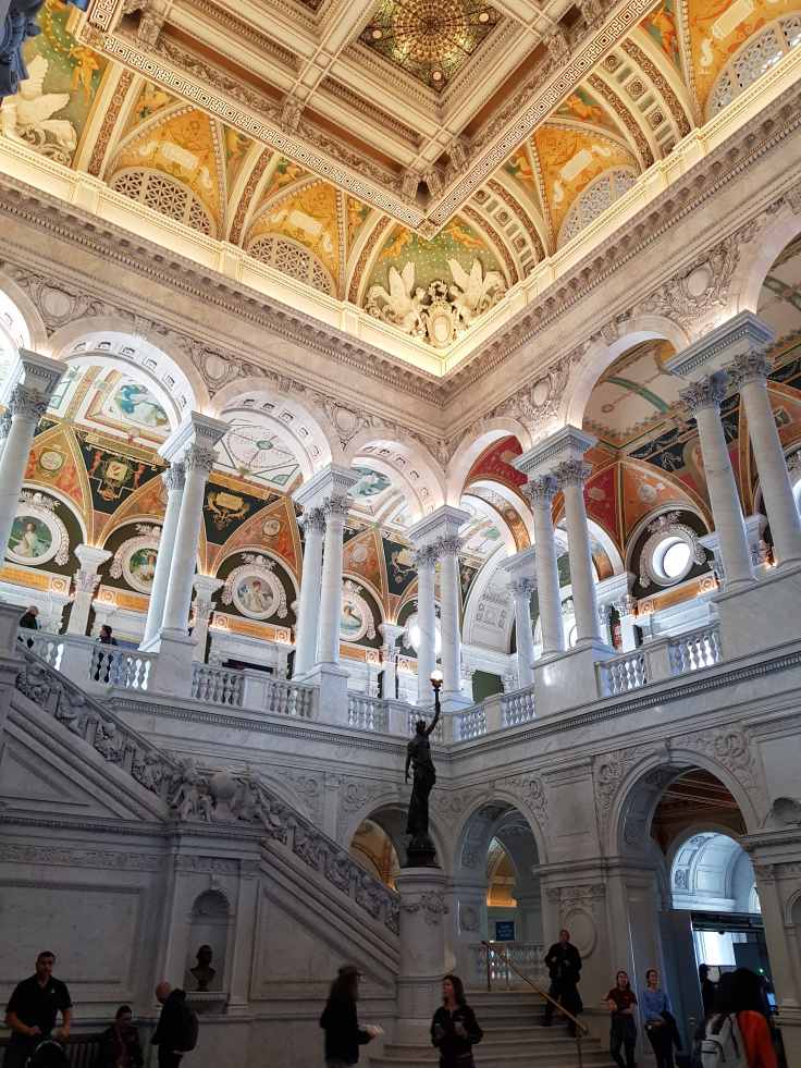 Ni bien entrás se ve la cúpula del Congreso, una réplica de la estatua de la libertad que corona la cúpula y la mesa donde el Presidente Lincoln firmó el acta de su segundo mandato y la primera piedra colocada George Washington para la construcción del Capitolio. 😉